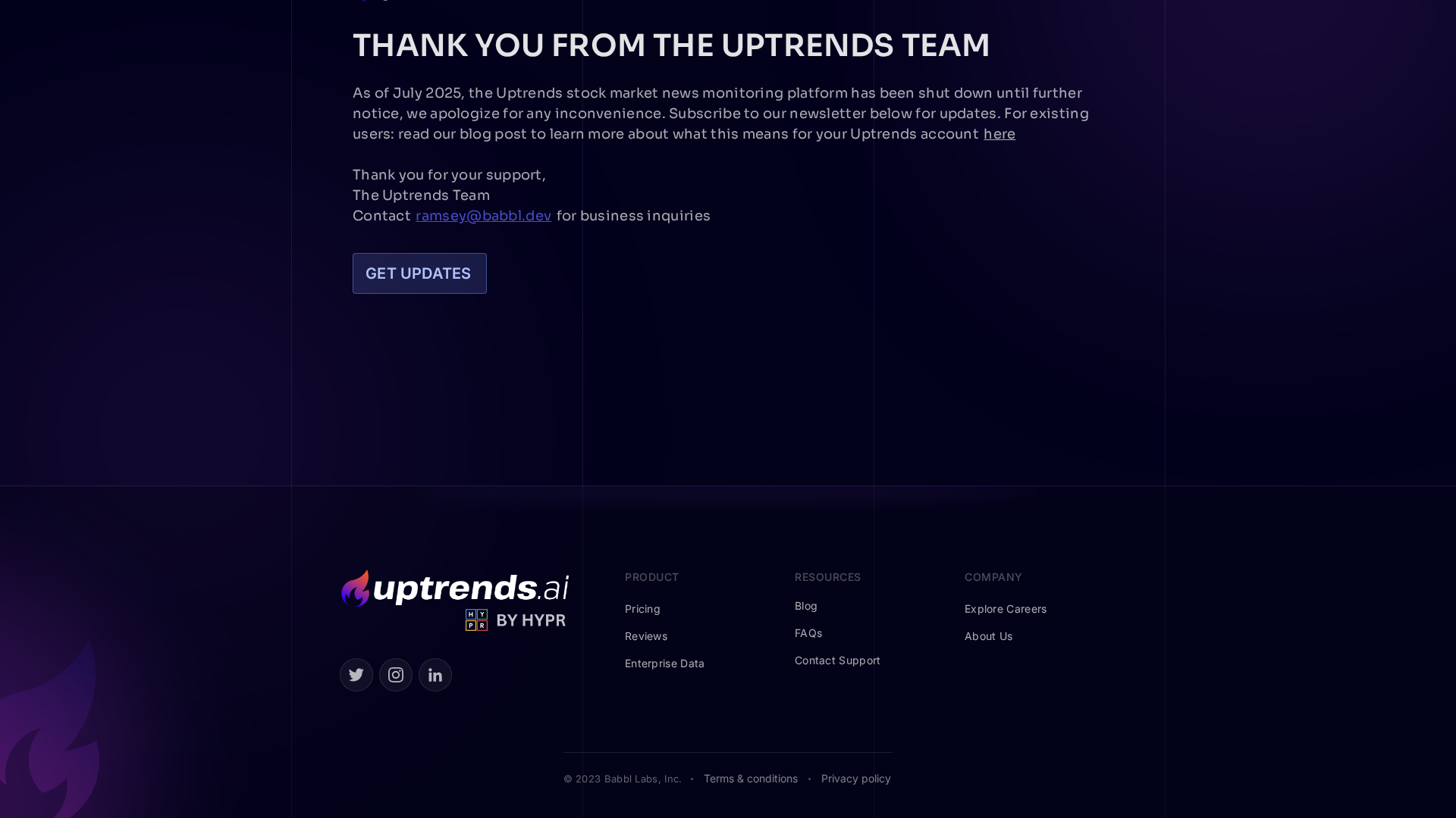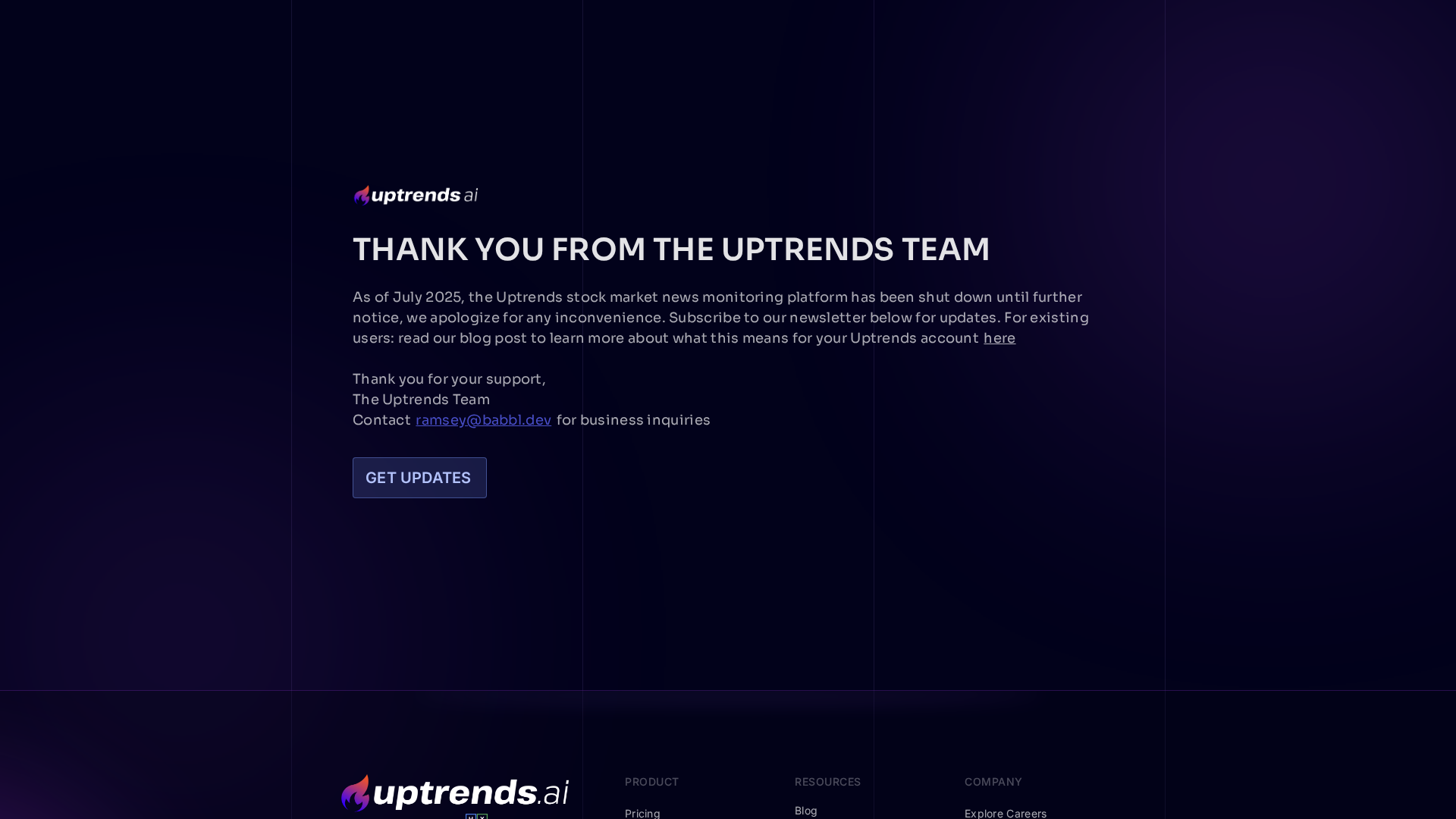 Uptrends temporarily shuts down its stock market news monitoring platform; updates will follow via newsletter and blog post.