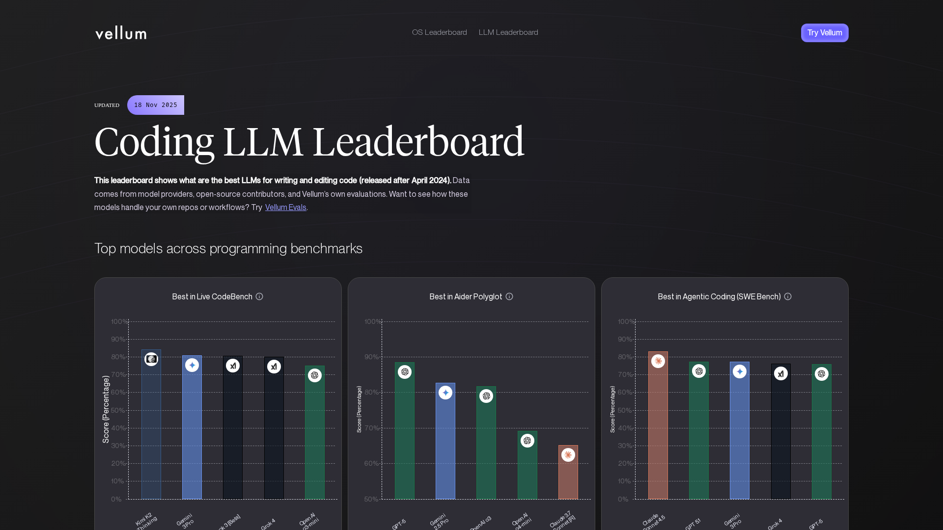 A data-driven leaderboard ranking post-2024 coding-focused LLMs across live benchmarks, polyglot abilities, tool use, and adaptive reasoning.