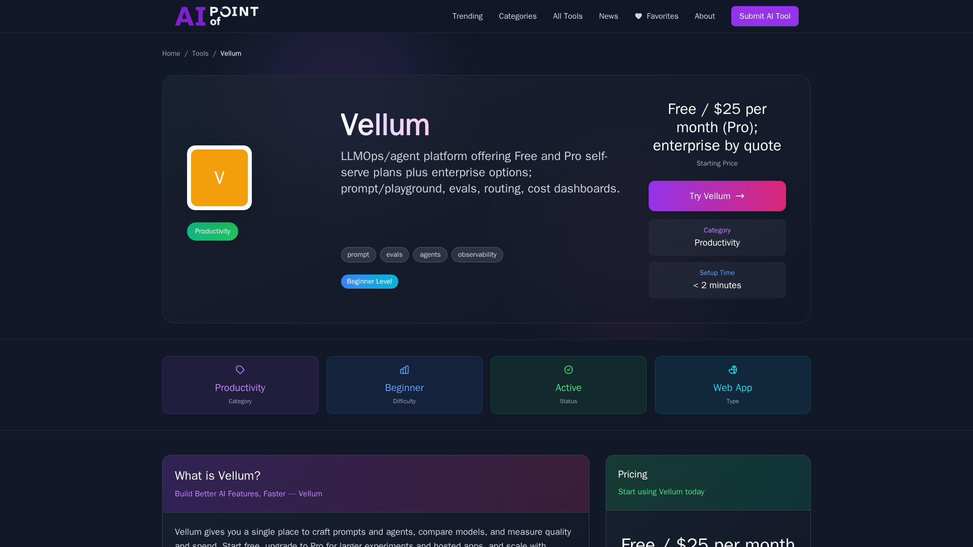 Vellum is an enterprise-ready AI productivity platform for prompts, agents, evals, and cost/performance tracking within professional workflows.