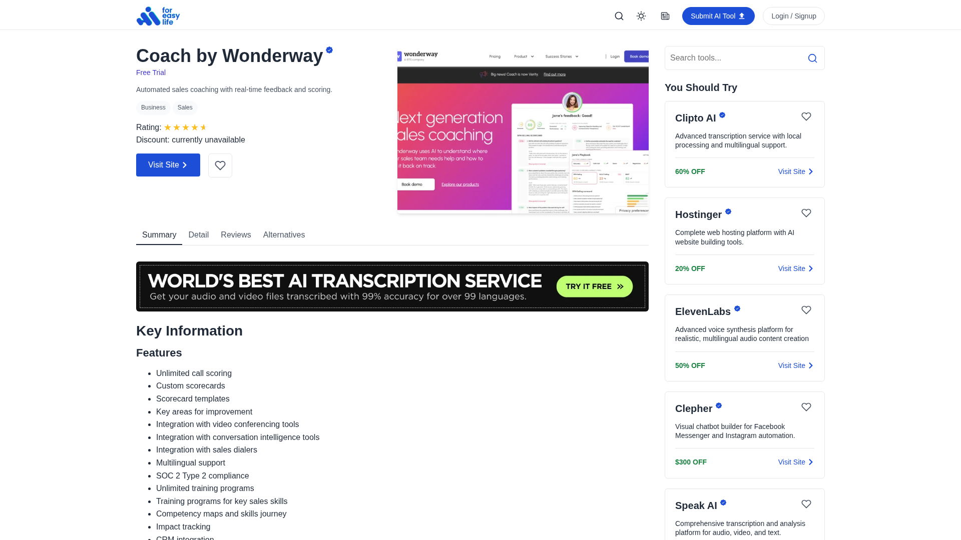 Verity (Wonderway’s AI Coach) automatically scores and analyzes every call using LLMs to fill scorecards and generate plain-language, manager-like coaching recommendations. Key capabilities include automatic call scoring and coaching, real-time feedback to reps during/after calls, playbook enforcement and benchmarking against top performers, customizable scorecards (templates for MEDDIC, SPIN, SPICED, etc.), an included Sales LMS (40+ programs mentioned) that links coaching/training to CRM outcomes, multiple assessment formats (role-plays, quizzes, pitch recordings), and team/individual dashboards with trend analysis and visibility into performance drivers. Product claims and ROI metrics shown on public pages include: 100% of calls scored and analyzed, ~90% time/cost savings for QA versus manual listening, 100% playbook adoption (claimed), 28% higher win rates and 11% higher employee retention (claimed impacts). Integrations and platform fit: pages list integrations broadly with video/conferencing (Zoom, Google Meet, Microsoft mentioned generally), conversation intelligence/CI and dialers (Gong, Chorus, Salesloft, Outreach, HubSpot Dialer, Dialpad, RingCentral as examples), and CRMs (Salesforce, HubSpot, Pipedrive). The product connects to Google APIs (privacy policy references Google Calendar use cases) and is hosted on Google Cloud. Security & privacy: encryption described as AES-256 at rest and TLS/SSL in transit. The product uses OpenAI APIs; the site states transcripts are not used to improve OpenAI services. GDPR compliance is stated, and the privacy policy describes data transfers with DPAs/SCCs and other safeguards. SOC II Type II compliance is referenced on pricing/feature pages. Access controls, audits, and standard security measures are described; the privacy policy provides contact information for data requests. Pricing & trials: public pages do not list detailed per-seat or per-feature prices. The site notes a free trial/“free to try” option but states pricing is by demo / custom quote; a pricing page exists but requires contacting sales. Some features (e.g., custom scorecards) are mentioned as included in plans, but specific plan rates were not extractable from the public site. Documentation & resources: product pages, product-update posts (e.g., "Coach is now Verity"), blog posts, and case studies/success stories were found. Privacy policy and imprint (company contact, legal info) are available. No comprehensive public developer API docs or public admin docs were found in top search results; these are likely provided during onboarding or via a customer portal. Contact & next steps listed on the site: demo request URL (https://www.wonderway.io/demo-request-main), general contact email [email protected], and imprint listing BTS Germany GmbH address and phone numbers (legal contact details). Recommendations and suggested demo questions included: confirm pricing model and free trial coverage, request SOC 2 Type II report and penetration test summaries, verify exact integrations and any connector/setup fees, confirm language support, ask about data retention and deletion workflows and whether transcripts/models are stored for your account, and request a short pilot to validate scorecard accuracy and coaching quality on actual calls.