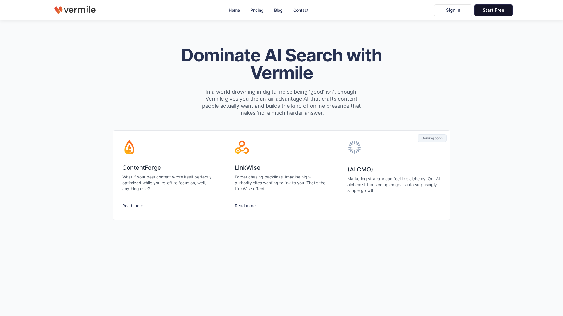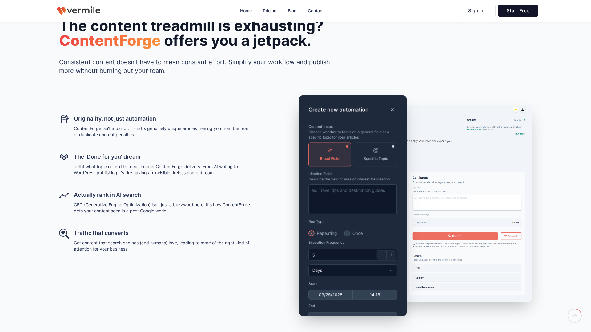 Vermile offers an AI-driven content platform (branded ContentForge) focused on producing original, SEO-optimized articles and automating end-to-end publishing workflows. The product emphasizes generating unique content that aims to perform well in AI-first search (GEO — Generative Engine Optimization), while automating tasks such as topic selection, keyword research, content generation, and publishing directly to WordPress. Vermile also highlights a LinkWise effect for lower-cost link-building and an emphasis on cognitive offloading for marketers — reducing decision fatigue and enabling strategic work. The platform supports multiple automations per connection and bilingual content (English and Greek), and uses a credit-based plan model with a free tier and paid tiers for higher usage and automation counts.