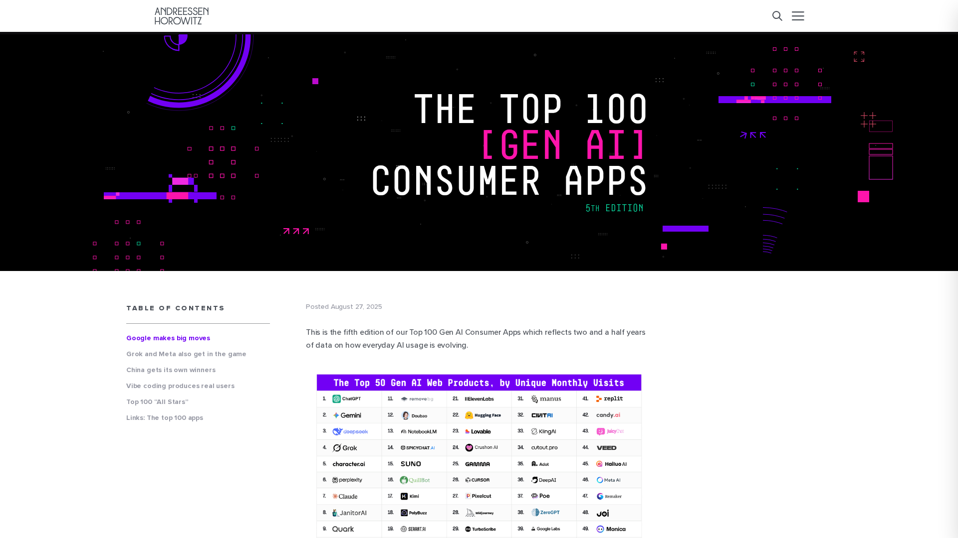 A16z’s 5th edition ranks the top 100 Gen AI consumer apps, spotlighting Google entries, Brink List movers, and vibe coding trends.
