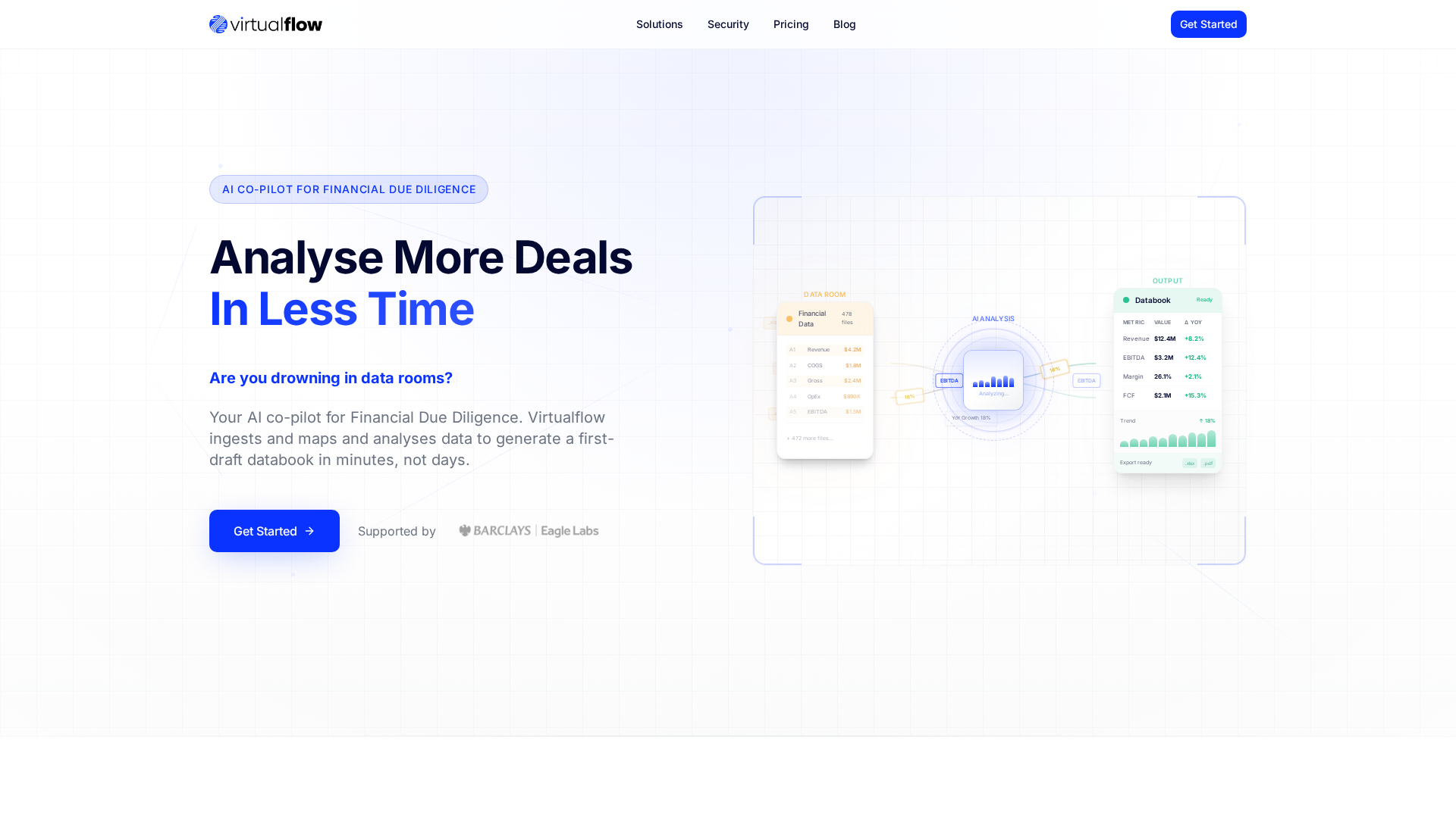 Virtualflow positions an AI Co‑Pilot for financial due diligence that ingests deal materials (financial statements, tax returns, schedules, contracts, and data-room documents) and converts them into structured, auditable insights. The platform emphasizes automated document classification and extraction, normalization and reconciliation of financial data across sources, anomaly detection and risk scoring, and generation of executive summaries, databooks, and variance analyses. Collaboration and governance features (annotations, tasking, evidence trails, access controls) are highlighted to support deal teams and external advisors. Integrations with data rooms and ERP/financial systems, encryption and audit logs are emphasized. Virtualflow is presented as a decision‑support tool that shortens diligence cycles and improves consistency while preserving human oversight and explainability.