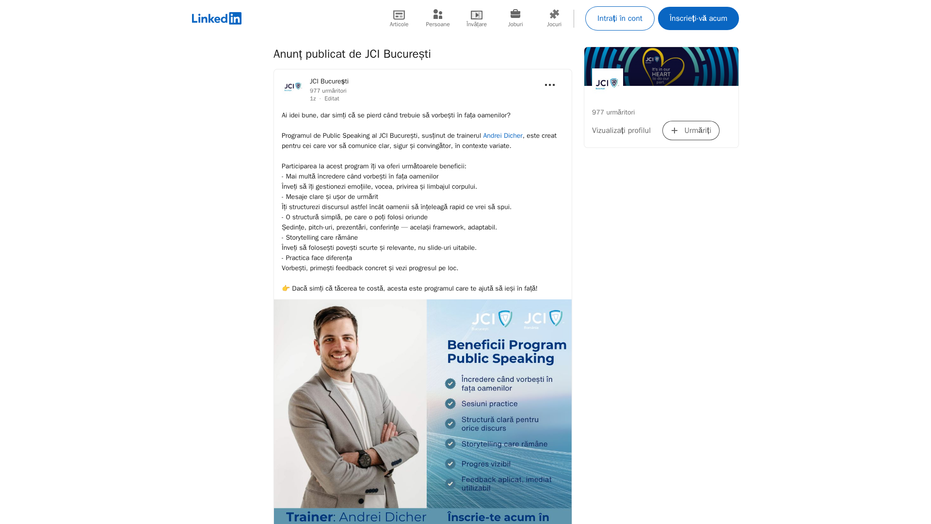 Programul JCI București cu Andrei Dicher promite încredere, mesaje clare și storytelling prin practică și feedback direct.