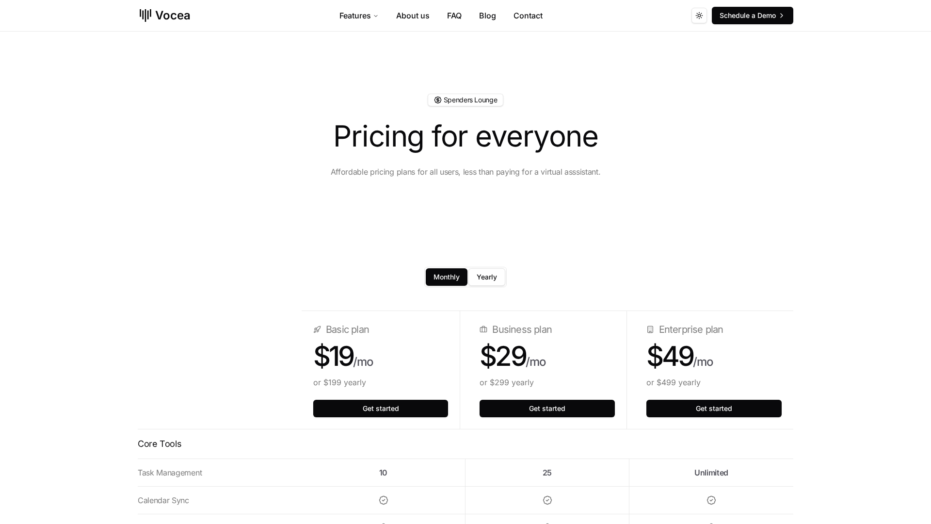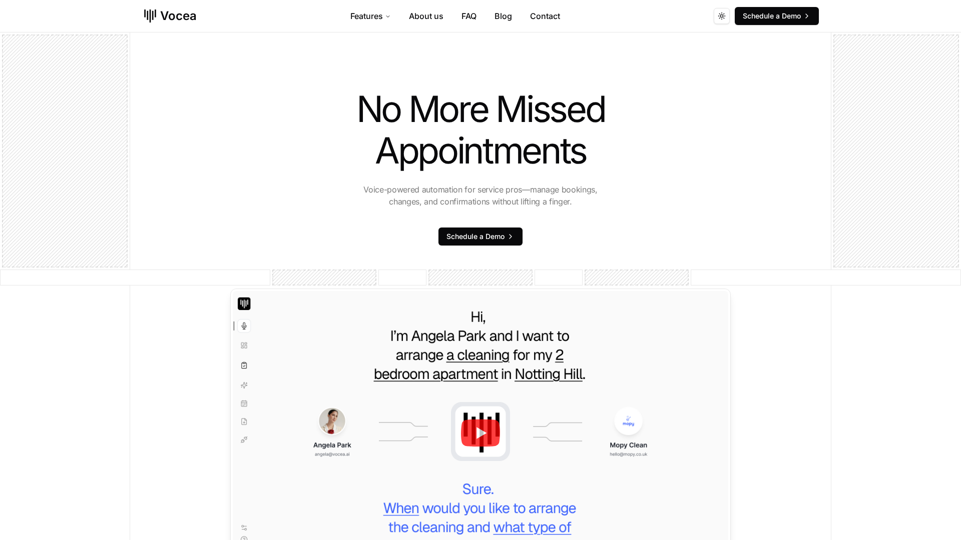 Vocea is an AI voice assistant designed for service providers (trades, auto shops, HVAC, plumbing, and related fields) to answer calls, book/confirm/modify/cancel appointments, and keep calendars in sync. It emphasizes 24/7 availability, quick onboarding with four steps (setup a phone number, add a calendar, let the assistant manage bookings, start using), prevention of double-bookings, and real-time calendar synchronization. It integrates with common calendars and CRMs and supports no-code setup along with an API for deeper integrations. Pricing is subscription-based with monthly or annual billing, and there is no public free trial noted. Public plans include Basic, Business, and Enterprise with varying capacities, analytics, and plan types (individual, team, enterprise). Billing auto-renews and Terms mention no refunds for unused portions of a billing period. Vocea also lists integrations such as Google Calendar, Calendly, Cal.com, and an API-based CRM, and references Slack and Trello in its Terms. Support and account details are provided on the Terms and Contact pages.