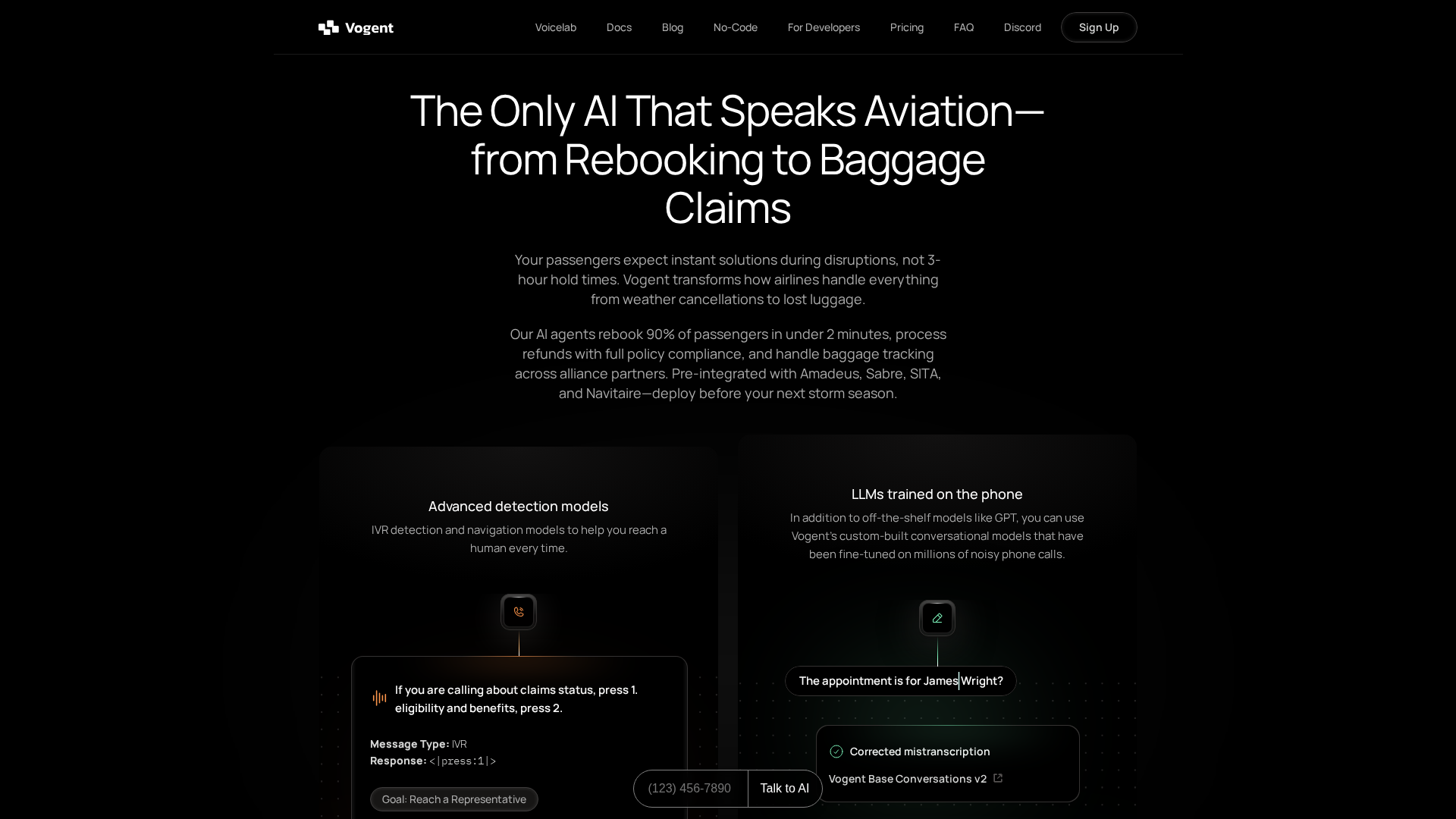 Vogent offers aviation-focused AI voice agents to automate disruptions from rebooking to baggage, with integrations, analytics, and developer tools.