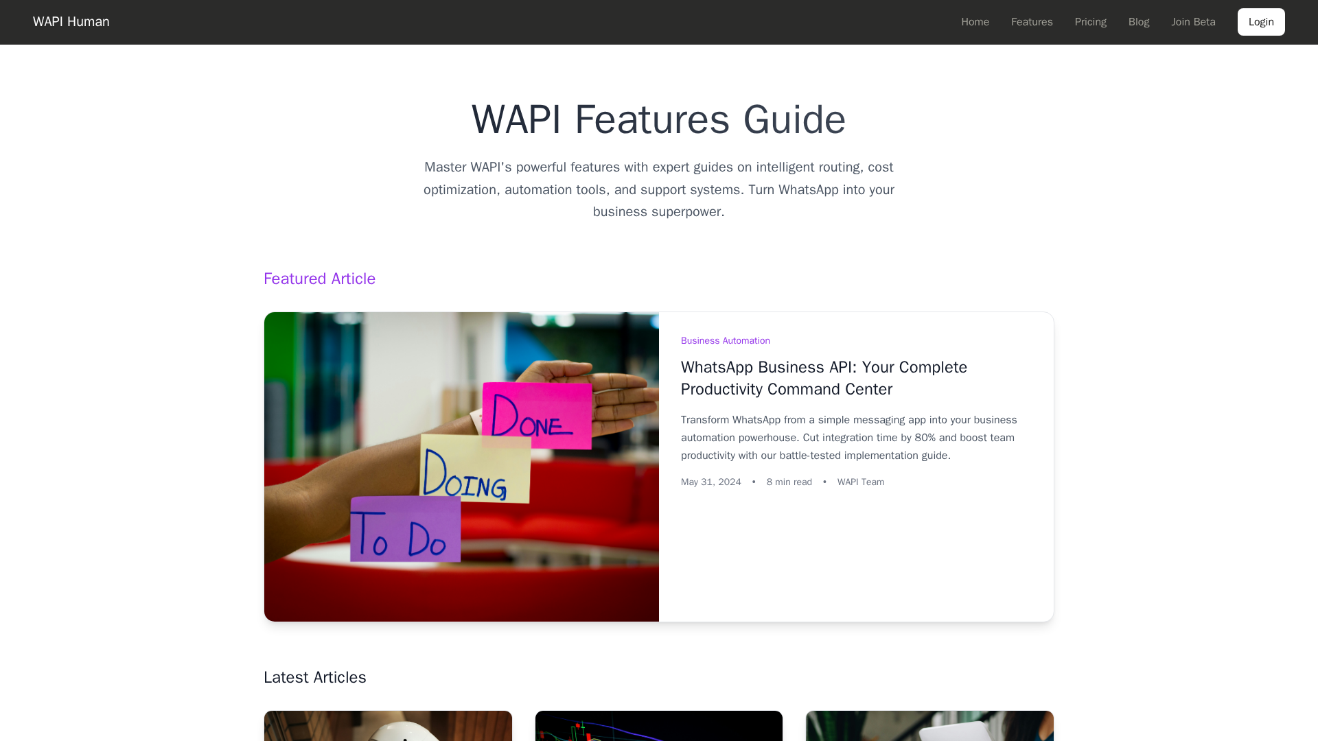 WAPI Human is an AI-powered productivity platform designed to bring "superhuman productivity" to WhatsApp by automating routine messaging tasks, managing tasks, and enabling smart messaging. The product aims to simplify WhatsApp Business API access and automate repetitive messaging for support, sales, notifications, and other workflows. Public pages include a Home page, Features page highlighting capabilities such as message templates, automated replies, scheduling, voice note transcription, task management, QR code generation, and a personalized AI assistant; an Integrations page noting Notion as a coming soon integration and a focus on keeping workflows in sync across tools. The Pricing page lists a Free plan at $0/month with 10 interactions per month, Pro at $10/month with unlimited interactions, and an Enterprise tier with custom pricing; signup shows fields for full name, email, and WhatsApp number. There are industry guides for different regions (USA, Canada, Singapore) and industry-specific use cases (healthcare, fintech, ecommerce, real estate), plus a customer support API, a blog with an integration guide, and a Chrome extension option called WAPI Sender. Limitations include pages not fully fetched in this session.