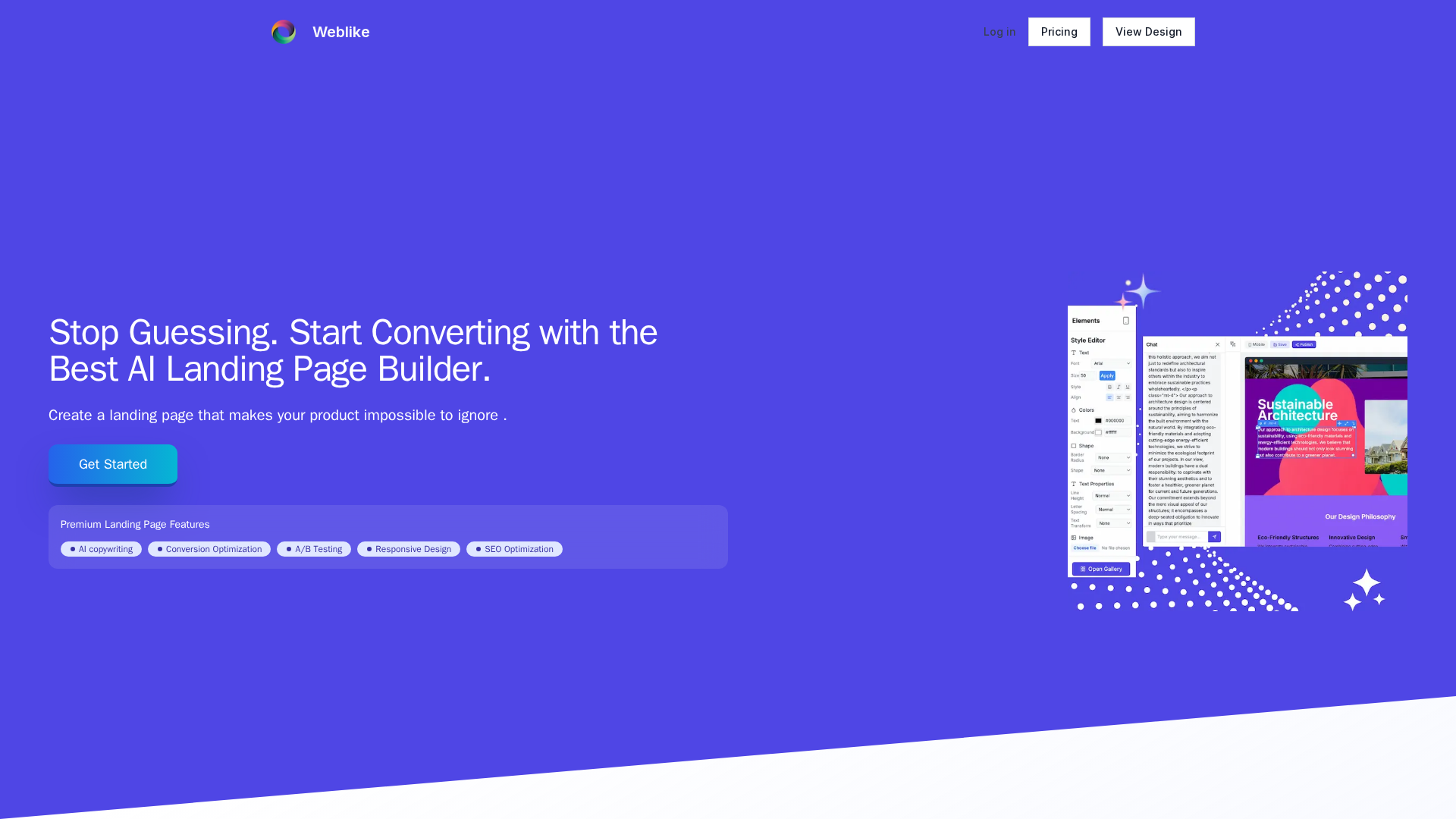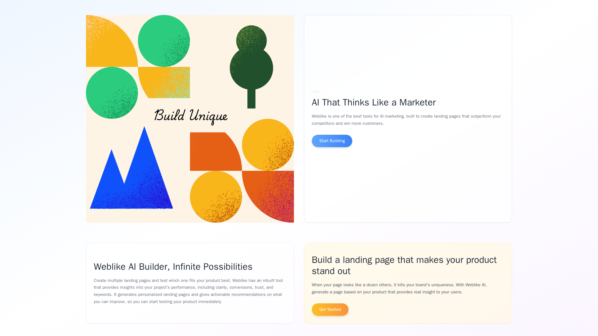 Weblike AI is an AI-first landing-page builder that generates tailored, conversion-focused landing pages from user inputs such as product descriptions, target customers, goals, and brand voice. The platform emphasizes producing fresh HTML/CSS/JS for each page (not just templates) and combines AI-driven copywriting, an AI image generator, and a drag-and-drop editor so non-technical users can quickly publish responsive pages. Built-in optimization tools include conversion insights, SEO suggestions, and A/B testing to help users iterate and discover the best-performing page variants. Publishing supports custom domains or a free subdomain, and the product includes analytics for clarity, conversions, trust, and keyword impact to guide improvements.