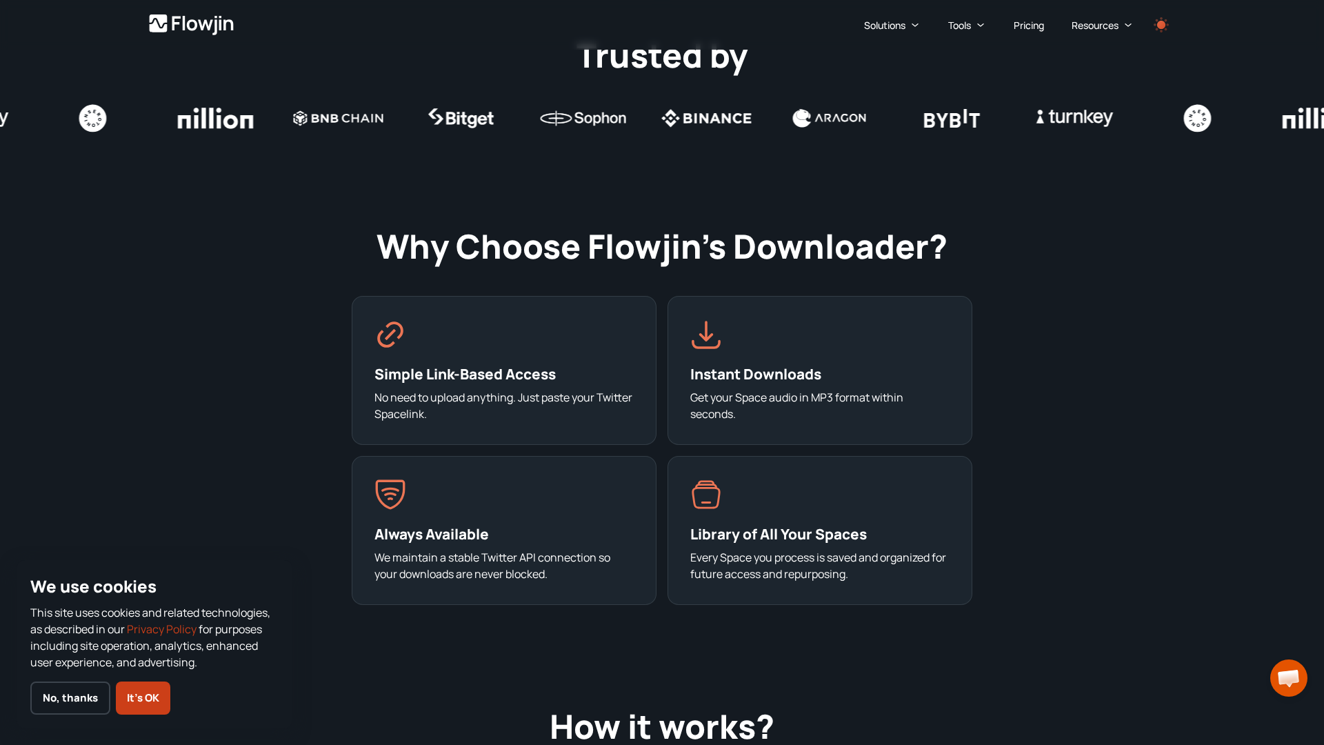 Flowjin’s Twitter Spaces Downloader is a web-based feature that fetches recordings of Twitter (X) Spaces via a simple link-based workflow, producing instant MP3 downloads, speaker-labeled transcriptions, and AI-generated summaries and clip-ready content. Users paste the Space URL, Flowjin connects (via Twitter’s API) to retrieve the audio/video recording, stores it in a personal Flowjin library, and provides tools to transcribe (multi-language), summarize, create social posts (tweets), and generate short clips for distribution. It’s positioned for creators and marketers who want to repurpose long-form audio into bite-sized, shareable content quickly — reducing post-production time and enabling ongoing content workflows with an archival library of processed Spaces.