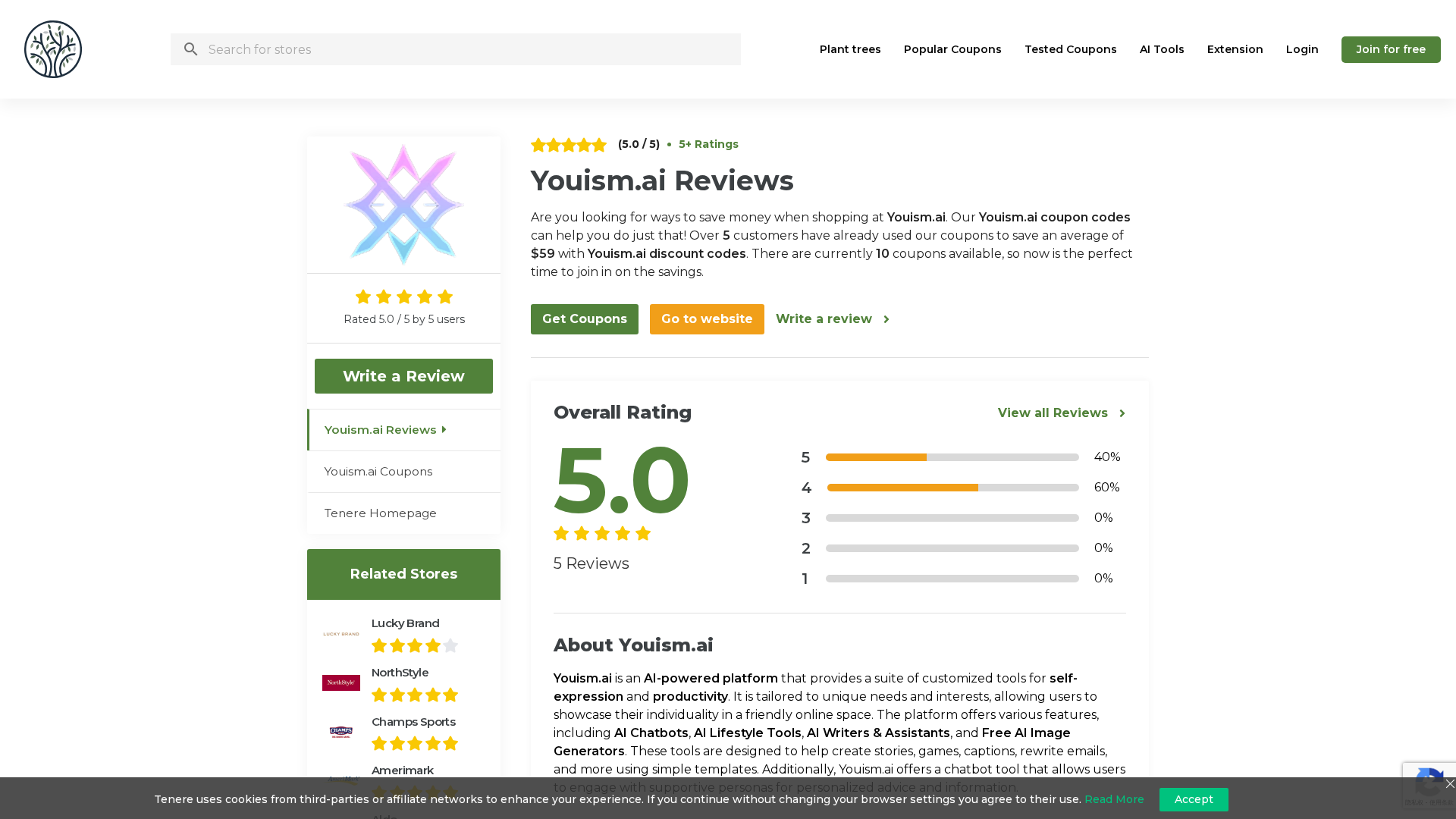 A coupon-focused review hub for Youism.ai with 5-star customer feedback and direct access to savings codes.