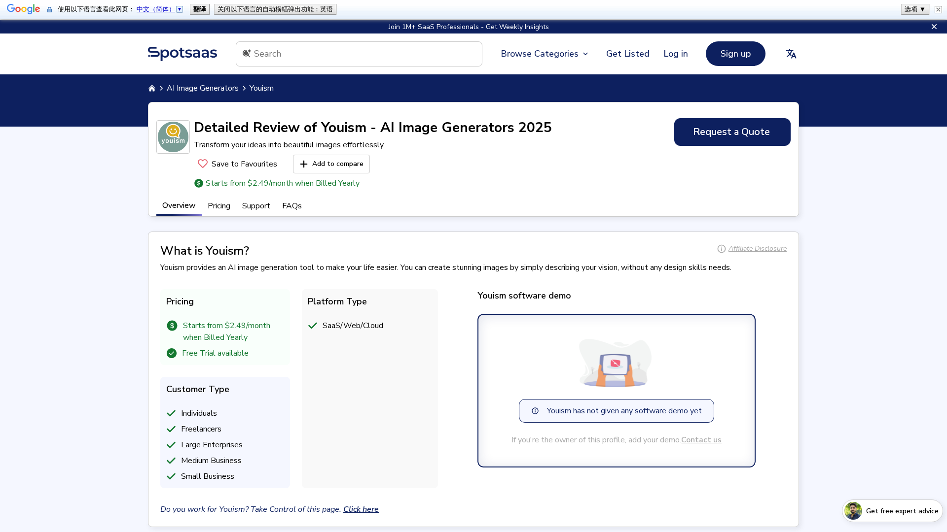 SpotSaaS review of Youism: an AI image generator starting at $2.49/month with free trial, lacking API and mobile apps.