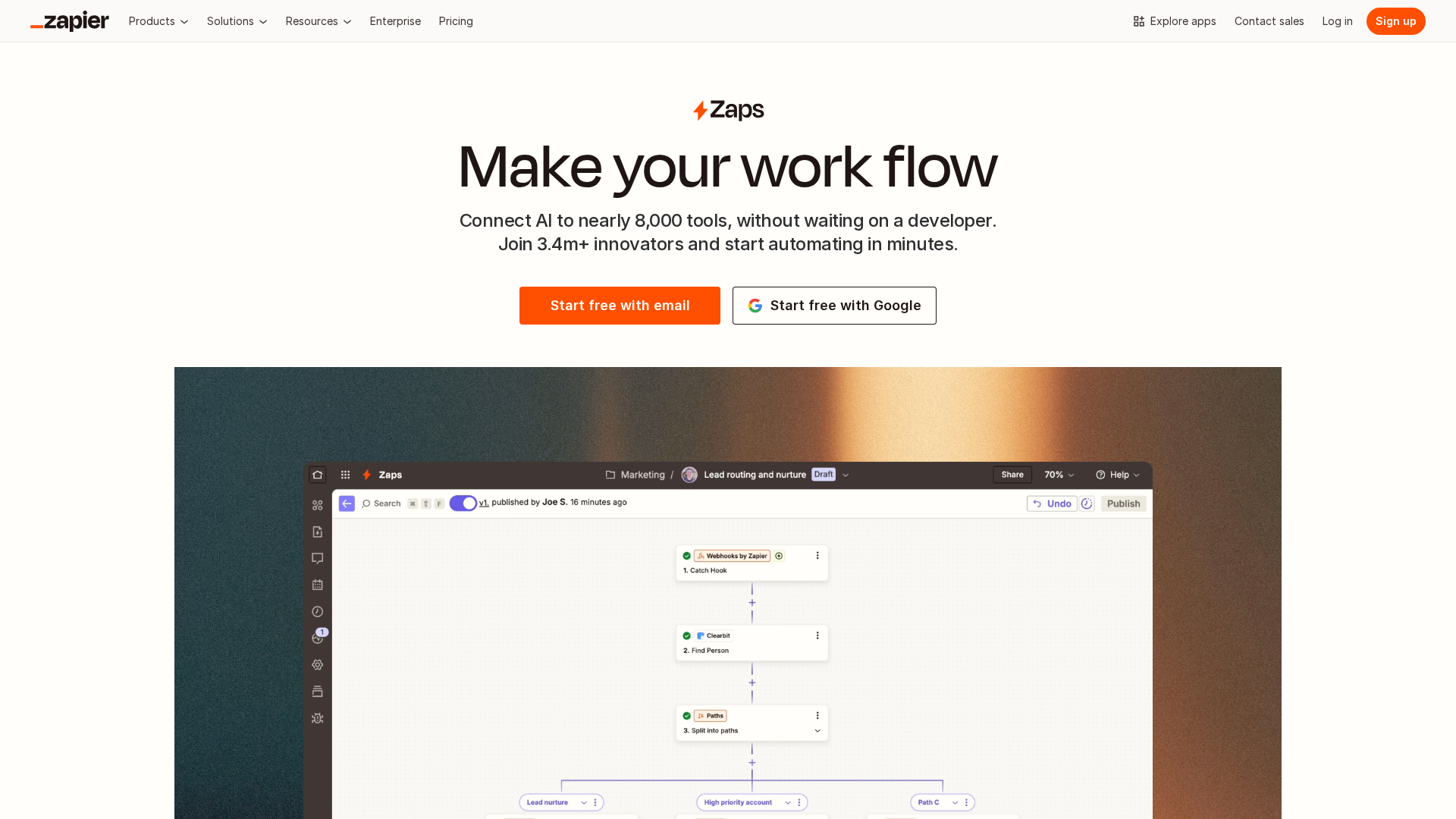 Zapier is a remote-first automation platform launched in 2011 that connects thousands of apps to automate workflows without writing code. It serves over 2 million businesses and operates with a global team of ~800+ employees across ~38 countries. The platform centers on a visual no-code Zap editor (Zaps = triggers → actions), Zapier Tables for data storage, and Zapier Interfaces for custom forms and front-ends, all designed to empower users to build complex automation without developers. It supports a vast ecosystem of apps (roughly 7,000–8,000) and extends automation with AI capabilities such as AI orchestration, AI agents (always-on agents acting on your data), chatbots, and Zapier MCP for secure AI tool calls. The product targets a wide audience from individuals to enterprises (Product/Team/Enterprise use cases) and emphasizes templates, enterprise use cases, and robust automation.