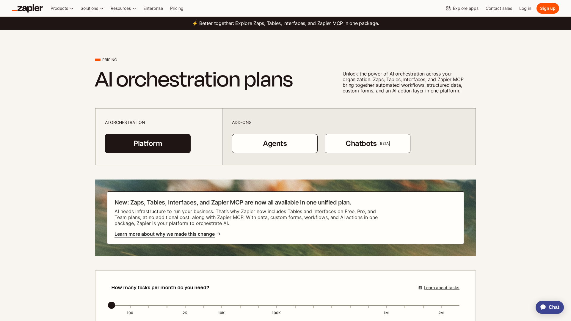 AI orchestration, AI agents (always-on agents), chatbots product line, and Zapier MCP for AI workflows.