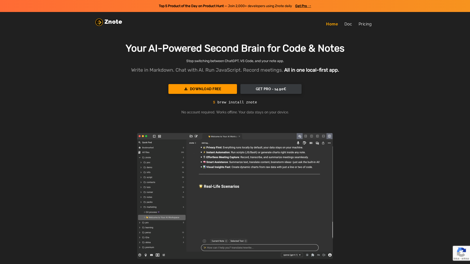 Znote is described as a local-first, developer-focused notebook that combines Markdown notes, built-in AI chat, and code execution (JavaScript/Node.js and Bash), with meeting transcription available offline. It emphasizes privacy with on-device storage and supports bring-your-own-LLM options (OpenAI, Ollama, OpenRouter, and local models). The homepage flags several core features: a Markdown editor with WYSIWYG; an AI chat attached to notes; the ability to run JavaScript/Node.js and Bash locally inside notes; offline meeting transcription and summarization; a code editor with autocomplete, multi-document workspaces, and full-text search. Pricing is shown as a free download and a Pro option at 14.90€ as a one-time license; a short summary notes a free basic option and a one-time Pro license that unlocks AI features, code execution, transcripts, themes, and removes the “Unlicensed” label, with a 30-day money-back guarantee. Some pages (/pricing, /doc) returned 404, so official pricing and documentation details are limited. Other references include guides, a blog, a GitHub repo, and Product Hunt mentions. Suggested next steps are listed.
