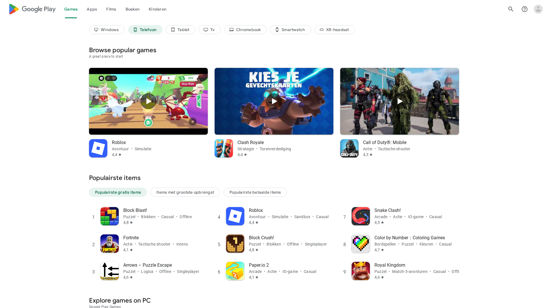 Een overzicht van de Nederlandse Google Play landingspagina voor Android-spellen met populaire titels en redactionele keuzes.