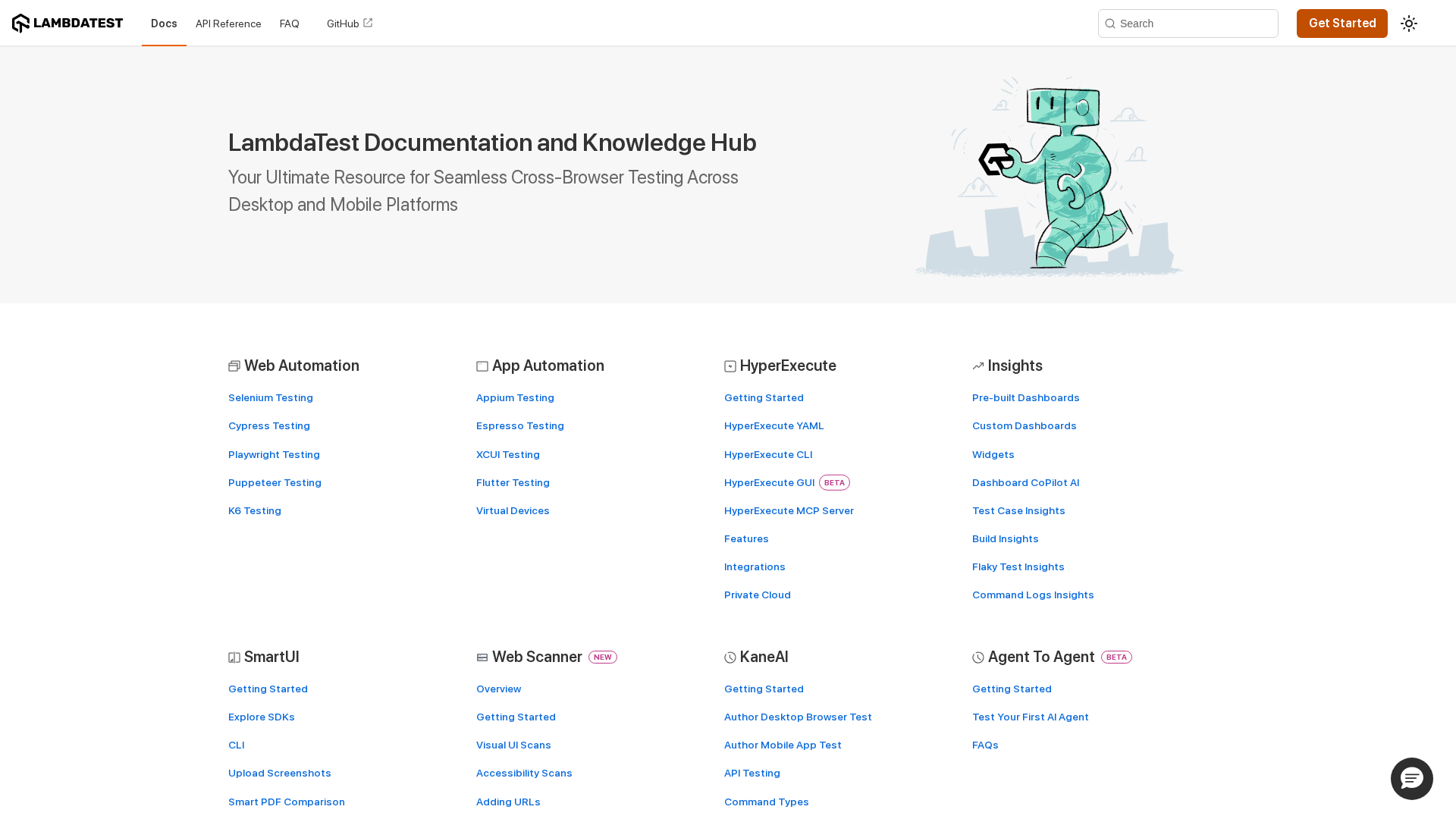 A centralized LambdaTest docs hub for cross-browser testing, automation, and AI-powered insights.
