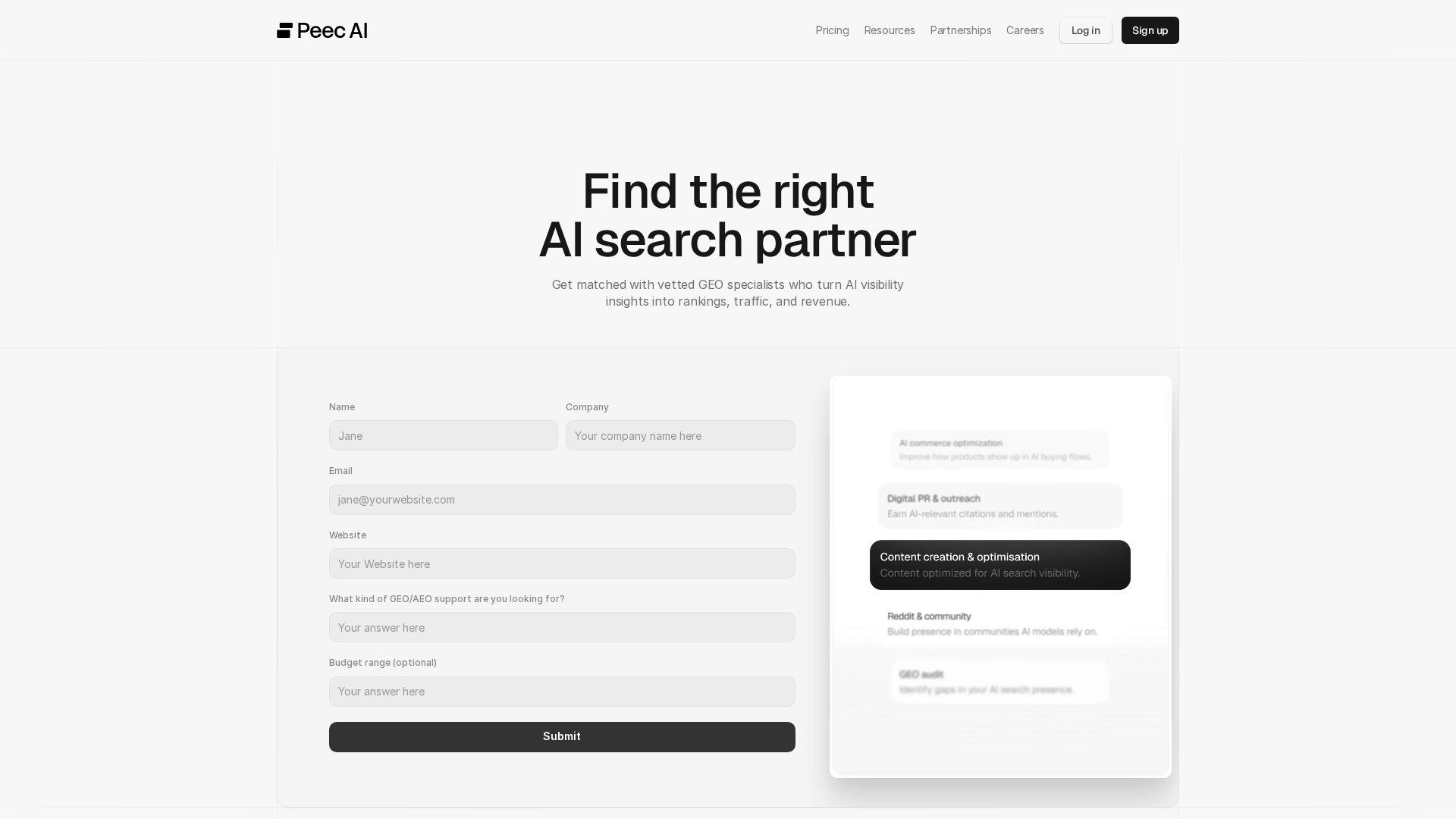 Overview of Peec AI's Directory connecting brands with vetted GEO/AEO experts for commission-free collaborations.