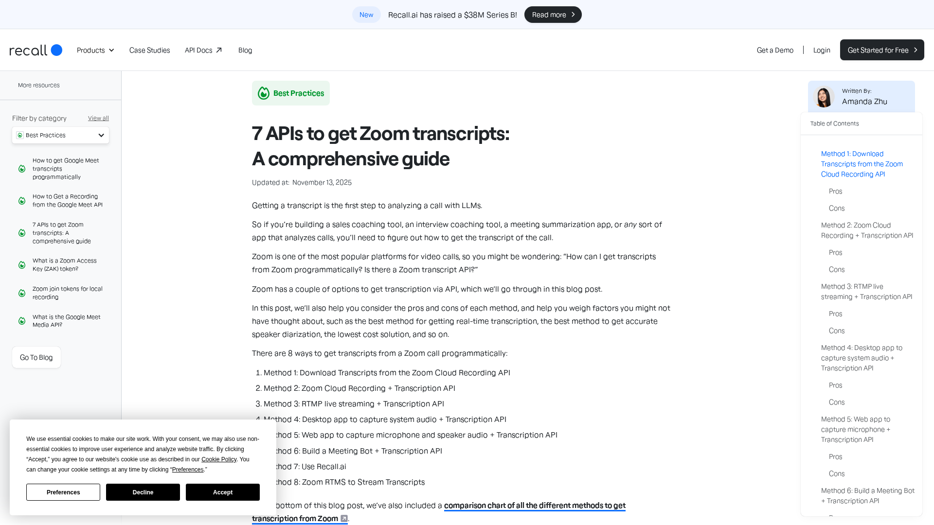 A comprehensive comparison of 8 Zoom transcript methods, from Cloud Recording to Recall.ai, covering real-time access, diarization, and costs.