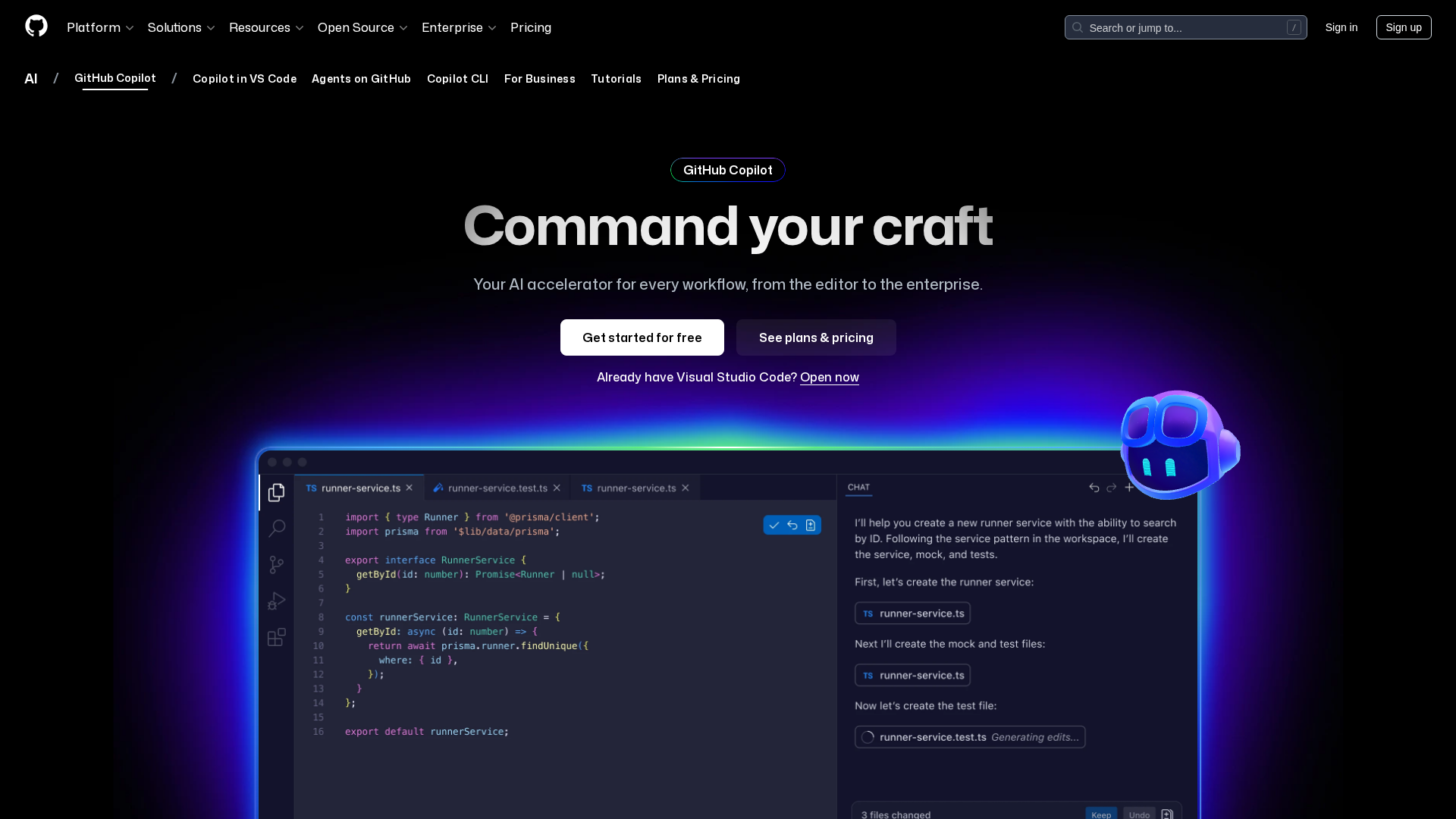 An AI pair programmer that gives code completions, chat help, and autonomous agent workflows across editors, theterminal