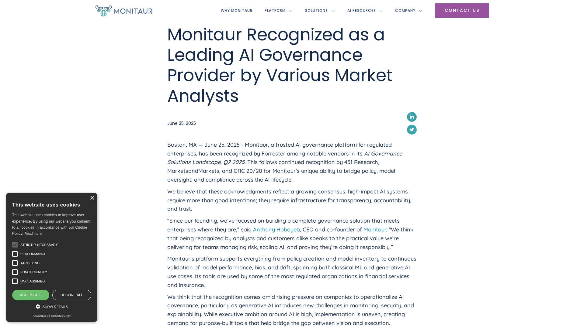 Insurance-focused enterprise AI governance platform centralizing policy, monitoring, validation, vendor governance and证e